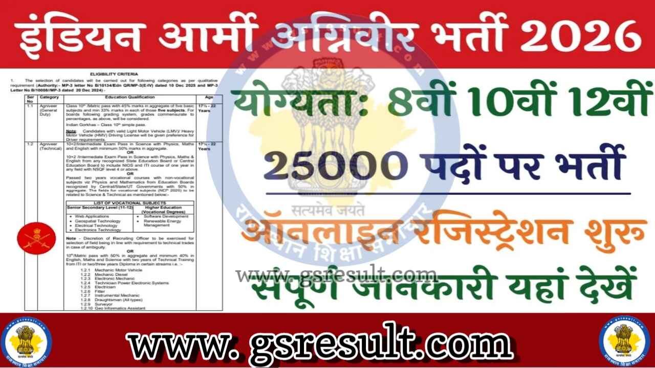 Indian Army Agniveer Recruitment 2026: इंडियन आर्मी अग्निवीर भर्ती 2026 का नोटिफिकेशन लगभग 25000 पदों पर जारी कर दिया है इसमें राजस्थान सहित सभी राज्यों के इंडियन आर्मी अग्निवीर भर्ती के नोटिफिकेशन जारी कर दिए हैं इस भर्ती के लिए सभी राज्यों के 8वीं/ 10वीं/ 12वीं पास पुरुष एवं महिला दोनों अभ्यर्थी आवेदन कर सकते हैं इसमें अभ्यर्थियों को इंडियन आर्मी की आधिकारिक वेबसाइट पर ऑनलाइन आवेदन फॉर्म भरना होगा इंडियन आर्मी अग्निवीर भर्ती 2026 के लिए आवेदन 13 फरवरी से लेकर 10 अप्रैल 2026 तक भरे जाएंगे।