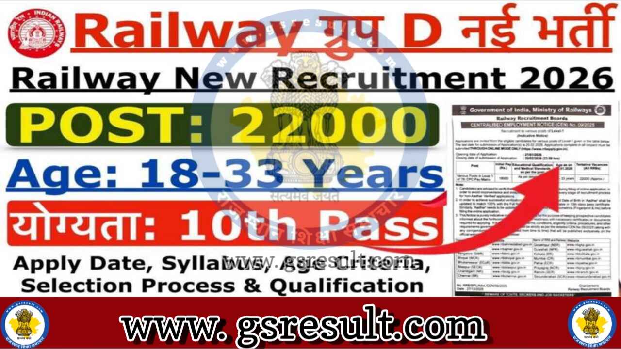 Railway Group D Bharti 2026: रेलवे में ग्रुप डी के 22195 पदों पर भर्ती का नोटिफिकेशन जारी कर दिया है इसके लिए भारत के सभी राज्यों के महिला और पुरुष अभ्यर्थी आवेदन कर सकते हैं इसके लिए 10वीं पास अभ्यर्थियों को ऑनलाइन मोड में आवेदन करना होगा आरआरबी ग्रुप डी भर्ती के लिए अभ्यर्थियों को संबंधित रेलवे रीजन की आधिकारिक वेबसाइट से ऑनलाइन आवेदन भरना होगा रेलवे ग्रुप डी भर्ती 2026 के लिए आवेदन 31 जनवरी से लेकर 9 मार्च 2026 तक भरे जाएंगे जबकि आवेदन शुल्क जमा करने की अंतिम तिथि 4 मार्च 2026 तक है इसके बाद अभ्यर्थी आवेदन फॉर्म में संशोधन 12 मार्च से लेकर 21 मार्च 2026 तक कर सकेंगे।