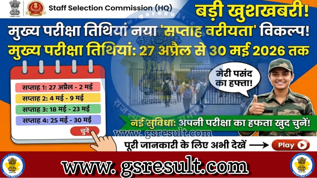SSC GD Constable Exam Date 2026: एसएससी जीडी कांस्टेबल परीक्षा तिथि को लेकर आधिकारिक नोटिस जारी कर दिया है एसएससी जीडी कांस्टेबल के लिए परीक्षा 27 अप्रैल से लेकर 30 मई 2026 तक आयोजित की जाएगी एसएससी जीडी कांस्टेबल के अभ्यर्थियों को पहली बार यह सुविधा दी गई है कि वह अपनी एग्जाम डेट के लिए प्राथमिकता अनुसार परीक्षा सप्ताह का चुनाव कर सकते हैं इसके लिए अभ्यर्थियों को 11 अप्रैल से लेकर 15 अप्रैल 2026 को शाम 5:00 तक का समय दिया गया है।